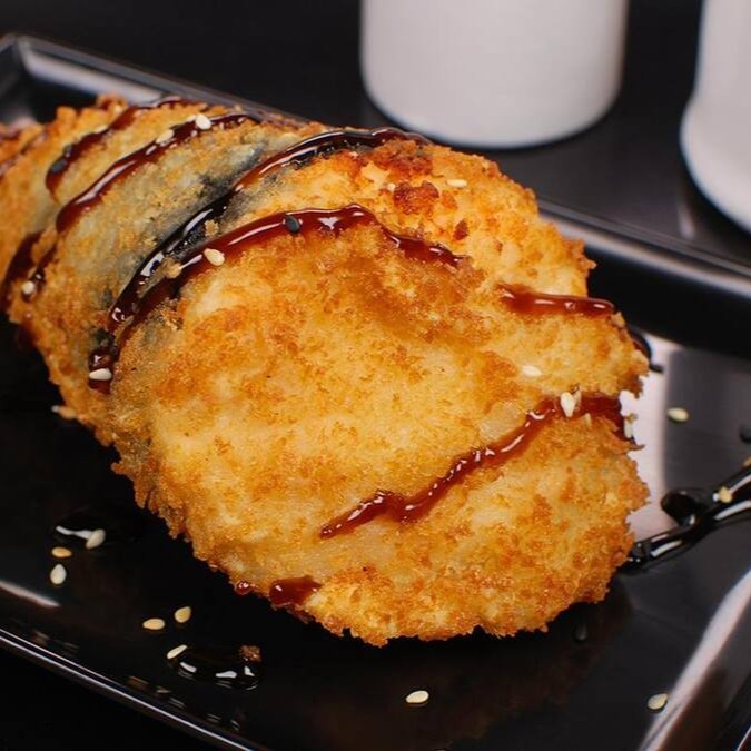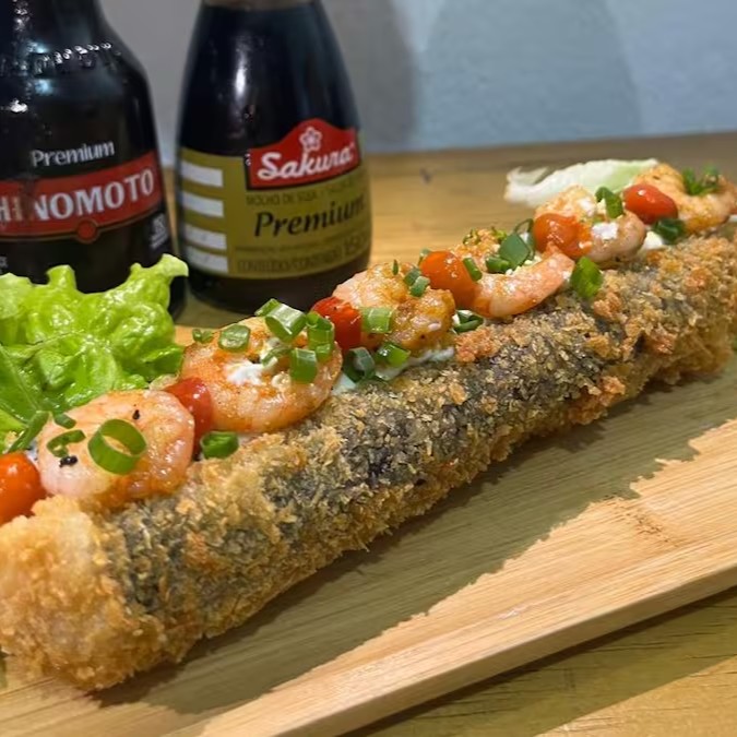 Temaki Hot Filadélfia Premium:Delicioso salmão, cream cheese, cebolinha, empanado na farinha panko.
