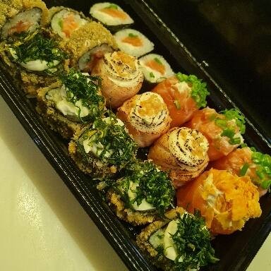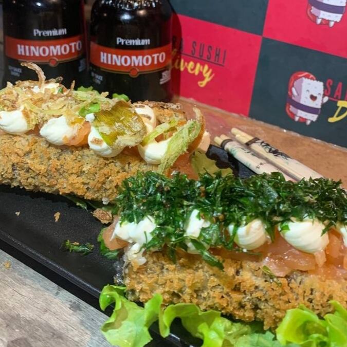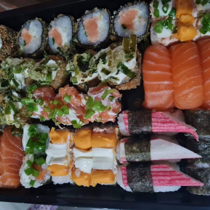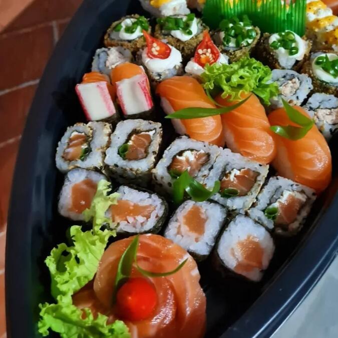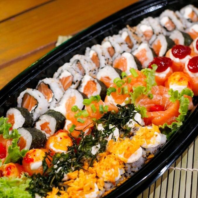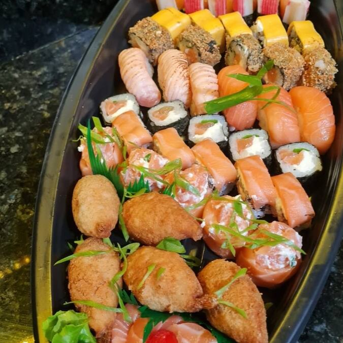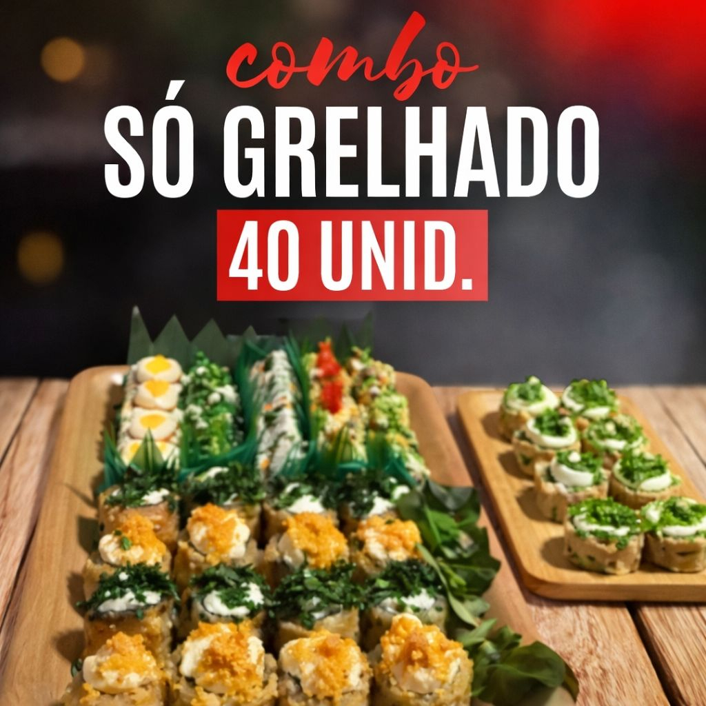 (40 Peças deliosas) 20 uni hots salmão ski com variações de hot Doritos e couve e tambem hots tradicional skin !!! 4 uni uramaki grelhado com geleia de pimenta 4 uni uramaki grelhado com pimenta biquinho 4 uni de uramaki grelhado com alho frito e cebolinho 8 uni uramaki grelhado pate de salão.