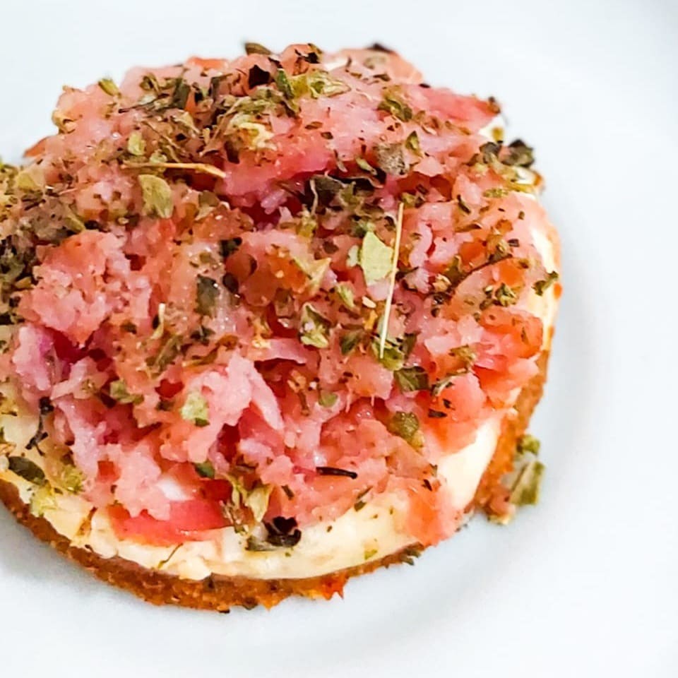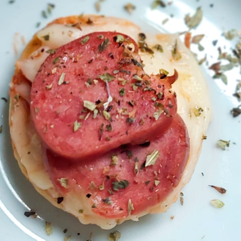 Mini pizza de peperoni com molho de tomate , mussarela , peperoni e orégano