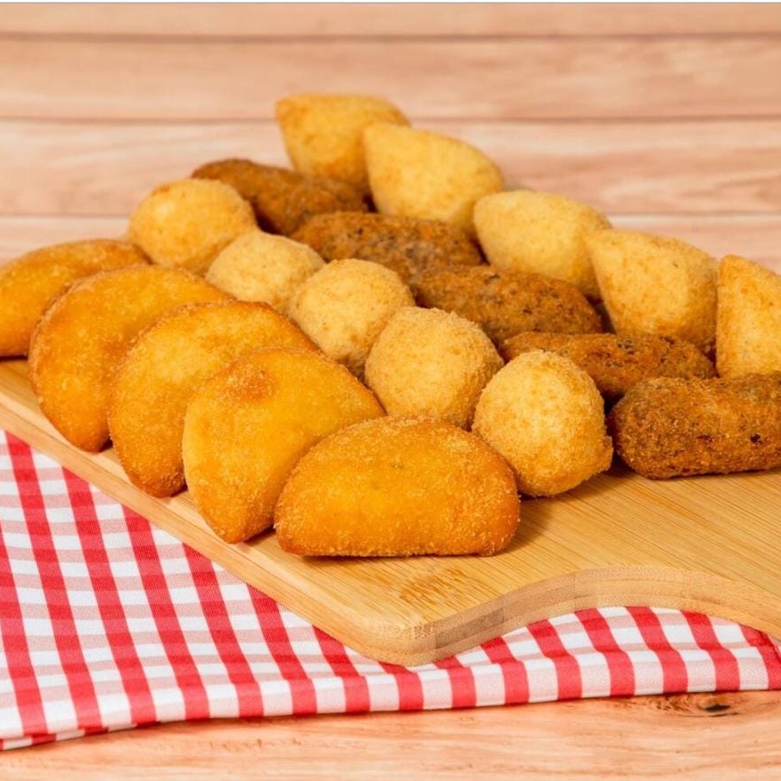 Coxinha, pastel de milho, palitinho de queijo, bolinha de mussarela e presunto, balãozinho de calabresa,