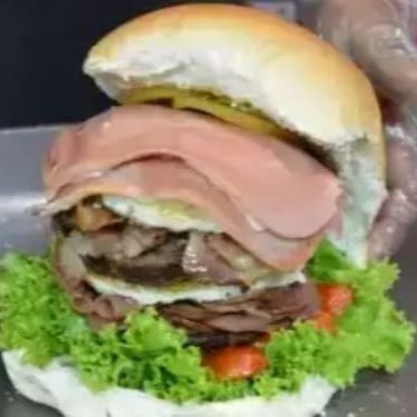 Pão, Bife de Hambúrguer 90g, Molho Barbecue, 2 Fatias de Presunto, 2 Fatias de Mussarela, Ovo, Bacon, Alface, Tomate, Catupiry, Milho e Batata palha