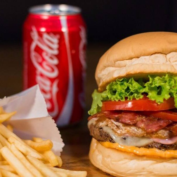 Pão, bife de hambúrguer 120g, molho barbecue, 2 fatias mussarela, alface, tomate, milho e batata palha + 1 refrigerante 200ml