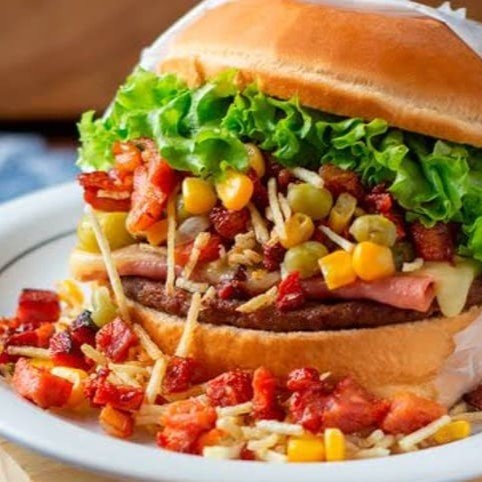 Pão, Bife de Hambúrguer 90g, Molho, Barbecue,Presunto, 2 fatias mussarela, Bacon, Alface, Tomate, Milho e Batata palha