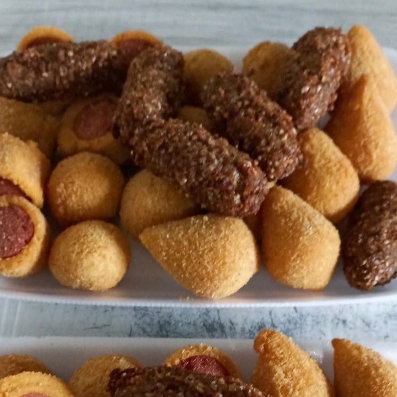 Que vai na bandeja coxinha, bolinha de milho, salsicha, travesseiro presunto e muçarela