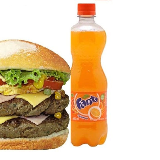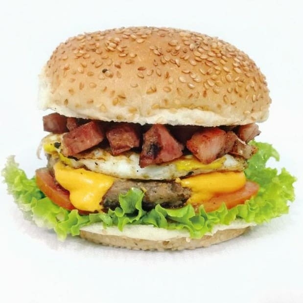 Pão, 2 hambúrguer artesanal 120gr, queijo, presunto, ovo, bacon, frango, cheddar, batata palha e salada.