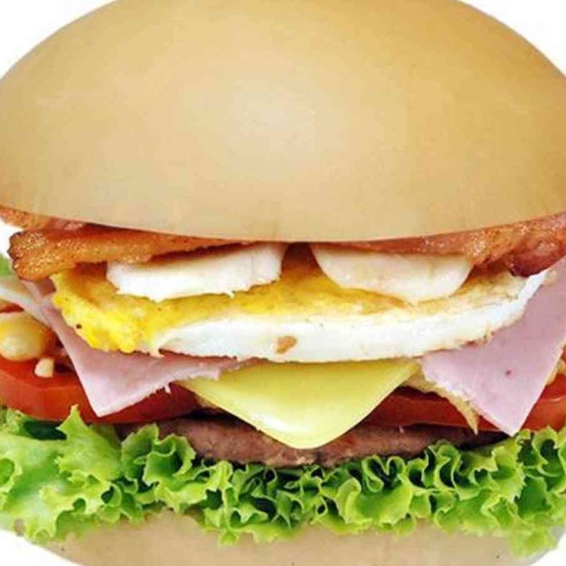Pão, molho especial sandubão, 2 bifes de Hambúrguer, presunto, mussarela, frango, calabresa, 2 ovos, bacon, alface, tomate, batata palha !