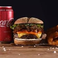 2 bifes especiais, dobro de queijo, cheddar, onions rings, bacon, molho barbecue, alface