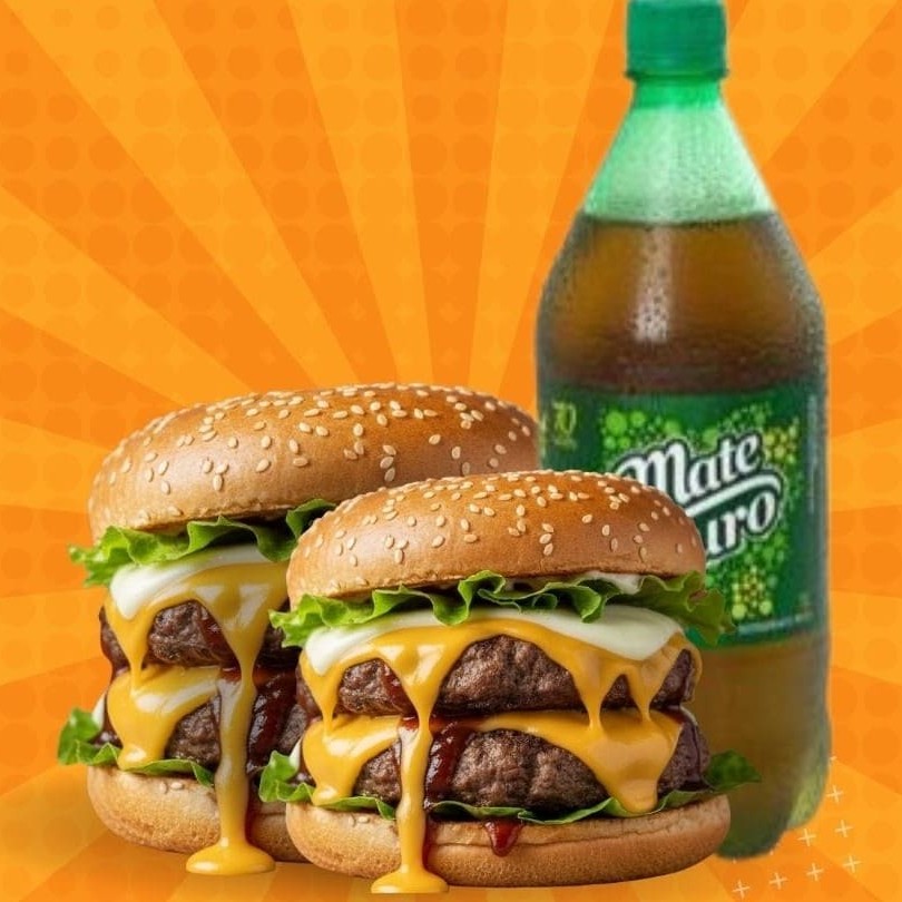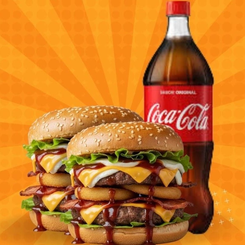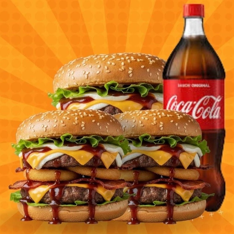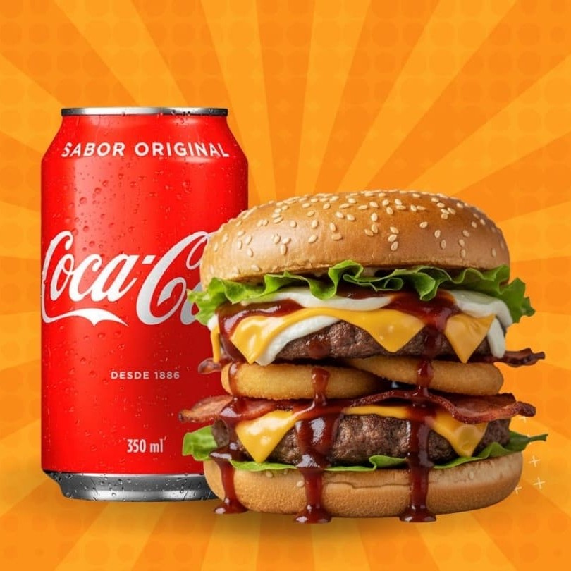 Pão ,2 bifes de picanha 120gr, cheddar , 2 mussarelas, molho barbecue , alface , tomate