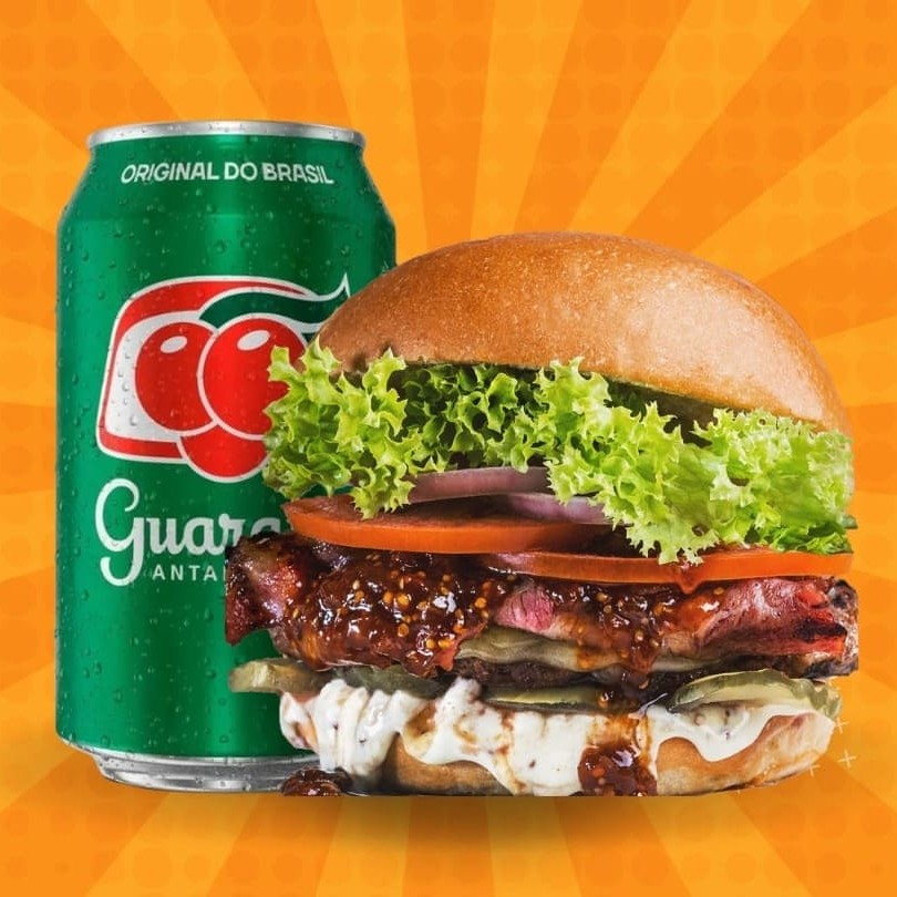 Pão, 2 bifes de picanha 120gr, cheddar, 2 mussarelas, molho barbecue e alface