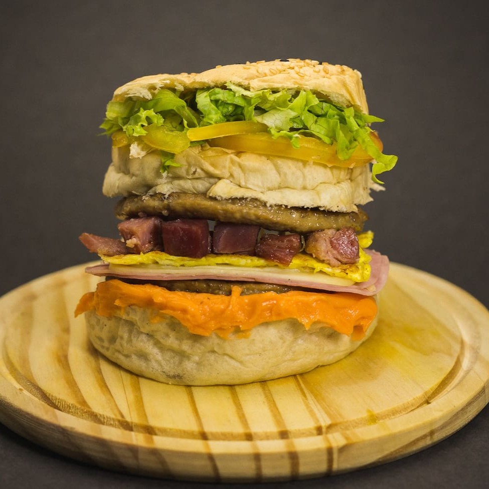 Pão, bife artesanal 120grs, presunto, mussarela, Catupiry, ovo, bacon batata palha e alface