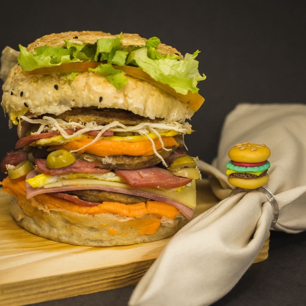 Pão com gergelim, 2 bifes de hambúrguer,bacon, calabresa, 2 ovos, presunto, mussarela,,batata palha, alface americana e tomate