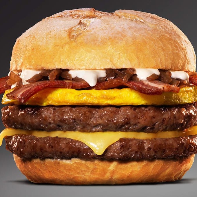 Pão com gergelim,bife de hambúrguer, presunto, mussarela , ovo, bacon, batata palha, alface americana e tomate