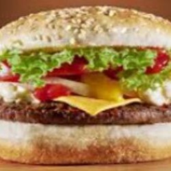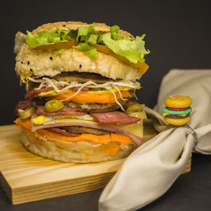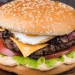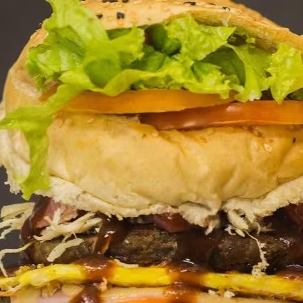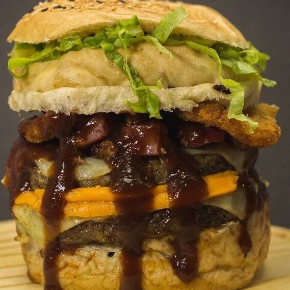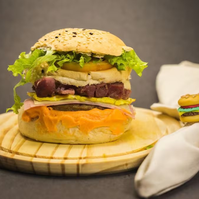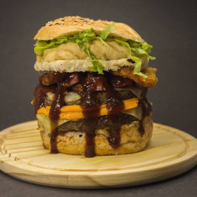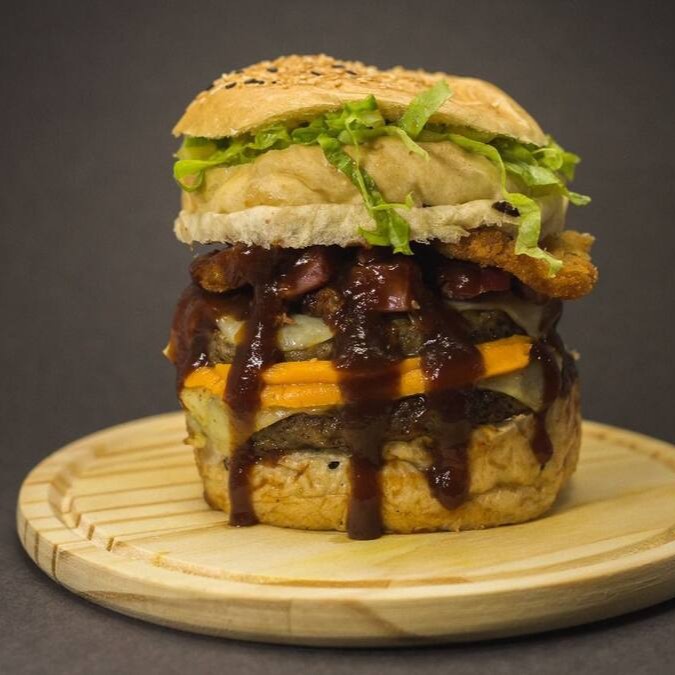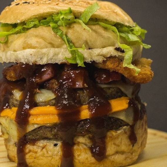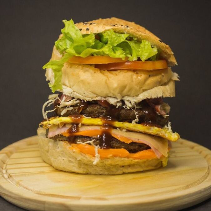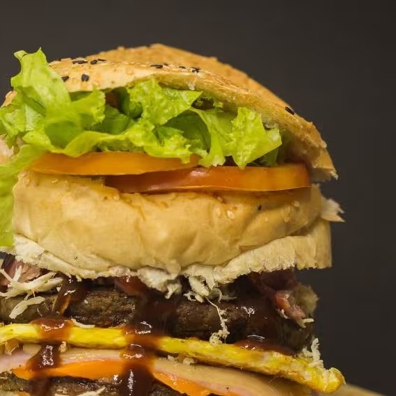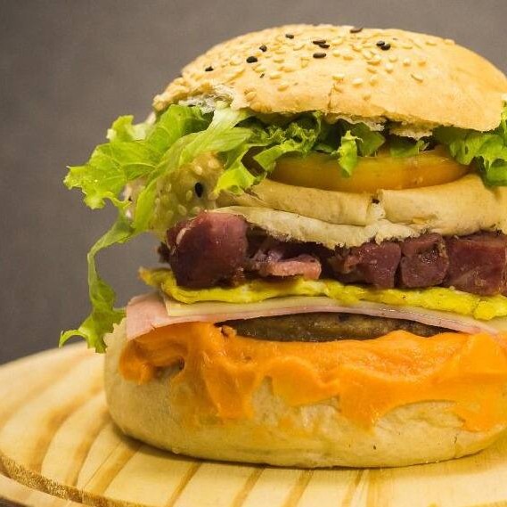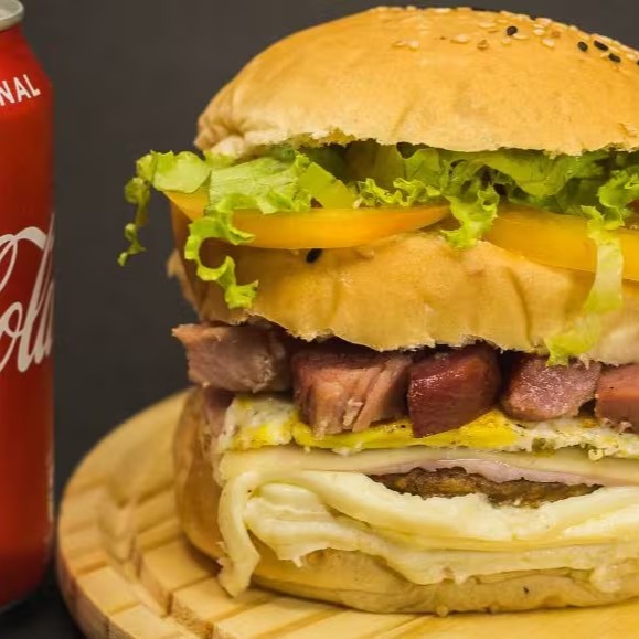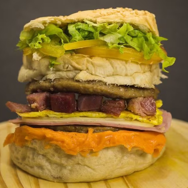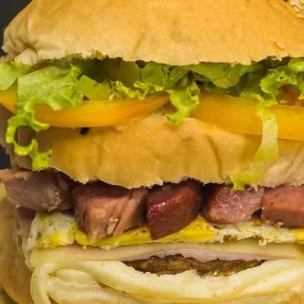 Hambúrguer com bacon crocante, presunto, mussarela e maionese especial, servido no sandubão com alface e batata palha.