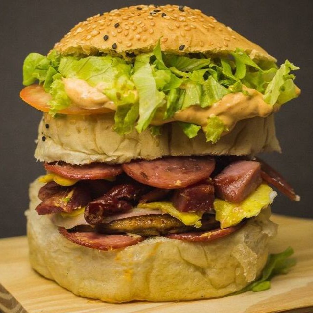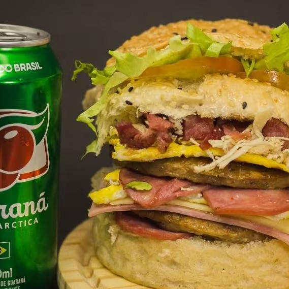 Três hambúrgueres, presunto, mussarela, ovos, frango, calabresa, bacon, cheddar, alface e maionese especial no sandubão com batata palha.