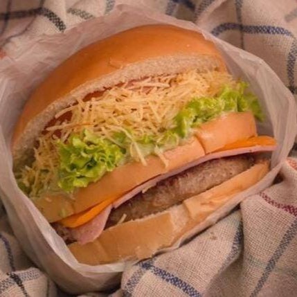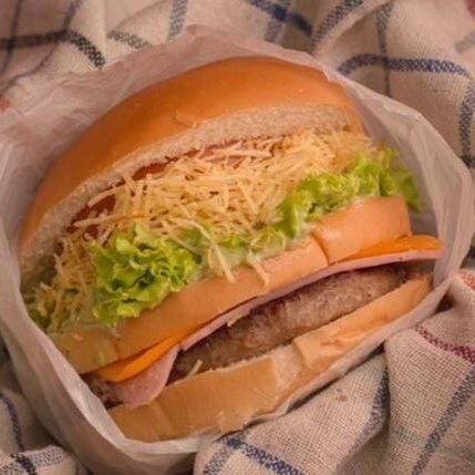 Pão, hambúrguer de boi,ovo, queijo,presunto,batata palha,salada e molho especial