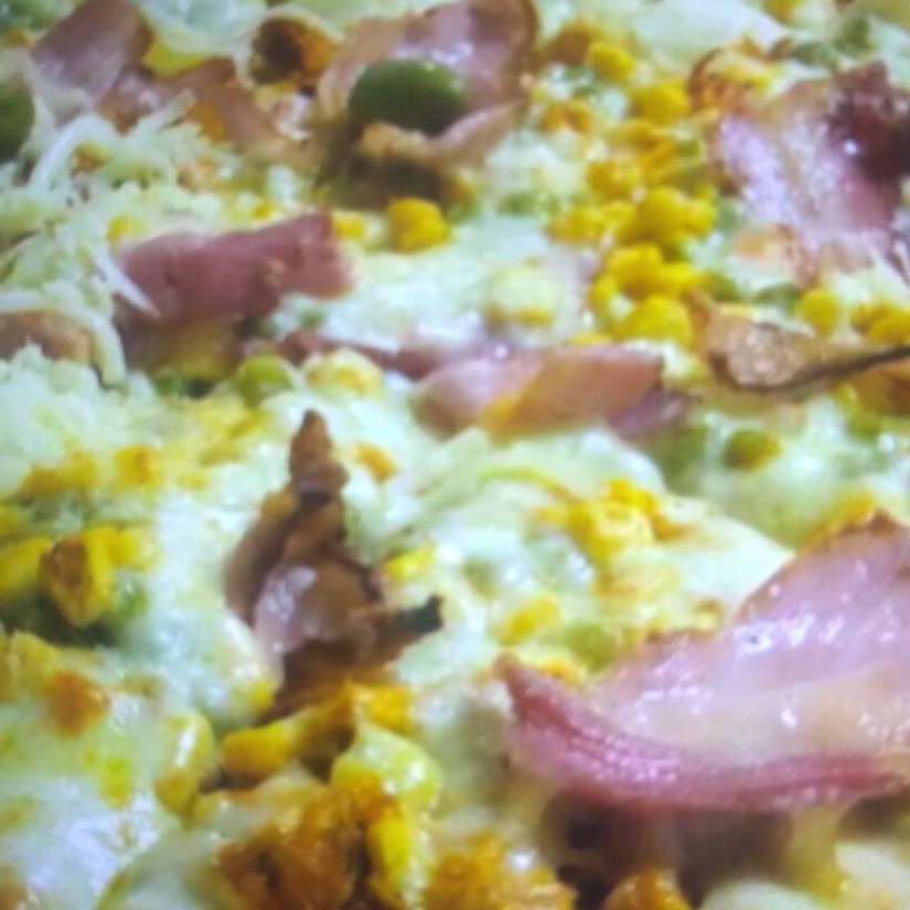Massa, Molho de Tomate, Calabresa, Bacon, Milho, Cebola, Pimentão, Tomate, Azeitona, Mussarela E Orégano.