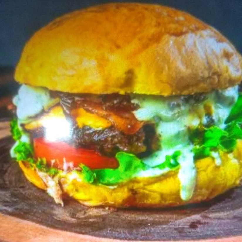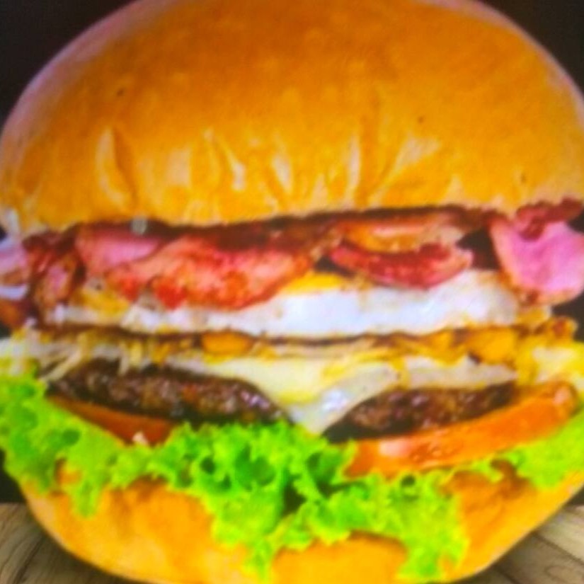 Pão,2 carne boi, queijo, bacon, cheddar e salada.