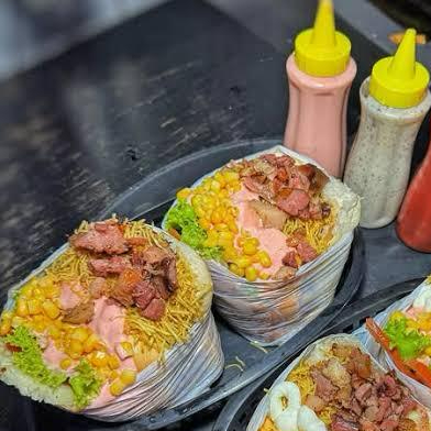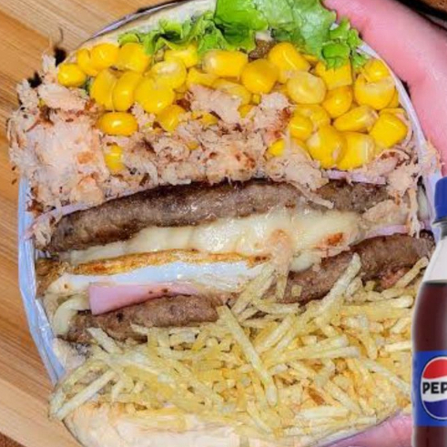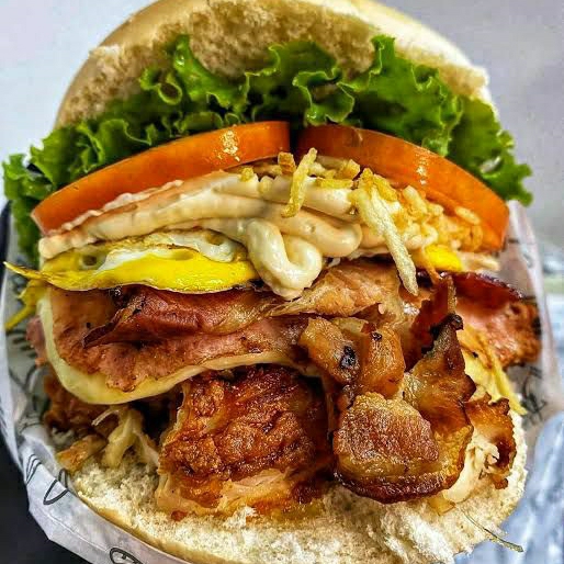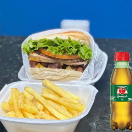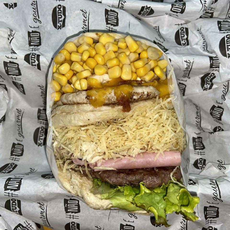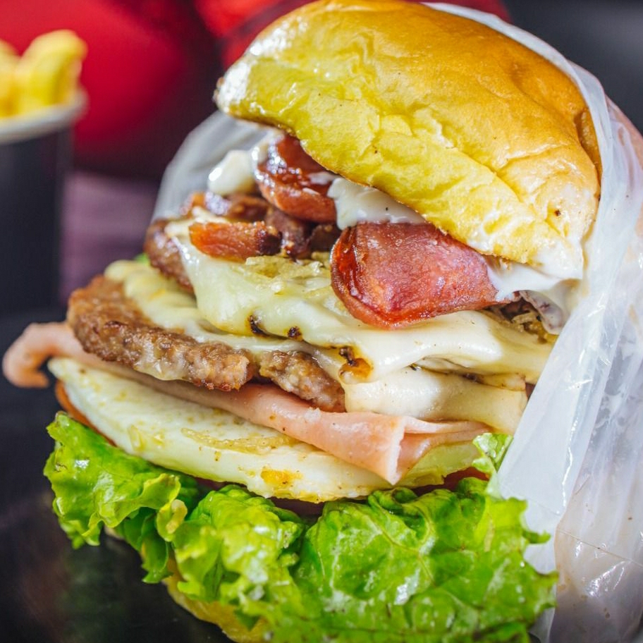 Pão, hambúrguer bovino, hambúrguer de frango, ovo, bacon crocante, presunto, queijo prato, alface, tomate, milho, batata palha extra fina e molho especial da casa + molho de alho.
