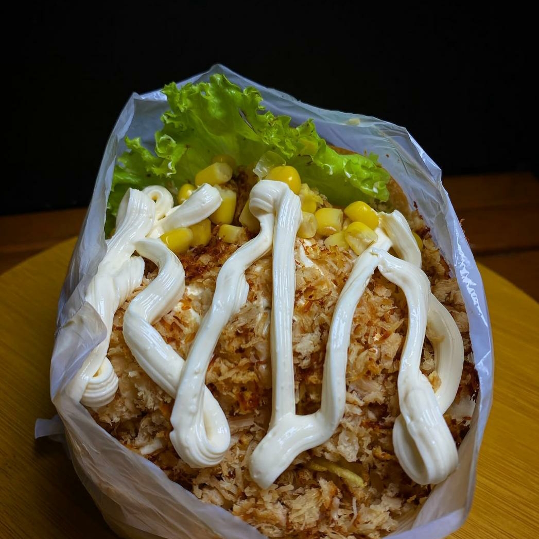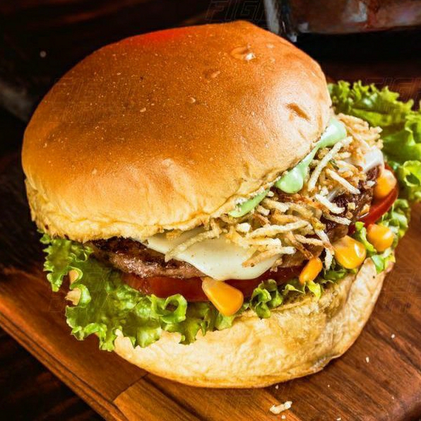 Pão, hambúrguer de picanha, ovo, bacon, presunto, queijo prato, milho, salada, batata palha e molho especial do coroa