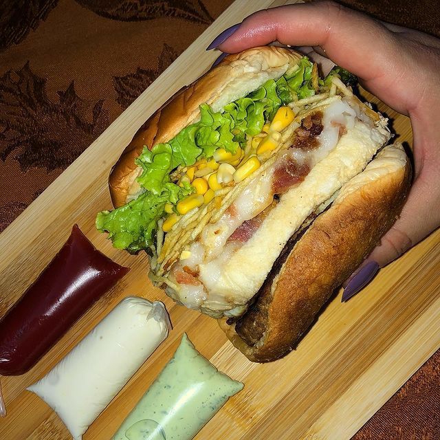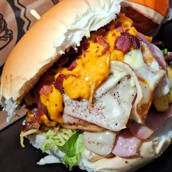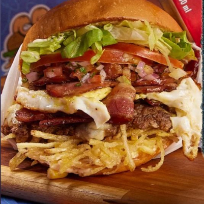 Pão, 2 hambúrgueres de picanha , 2 ovos, bacon crocante, 2 fatias de presunto, 2 queijos prato, alface, tomate, milho, batata palha extra fina e molho especial da casa + molho de alho.