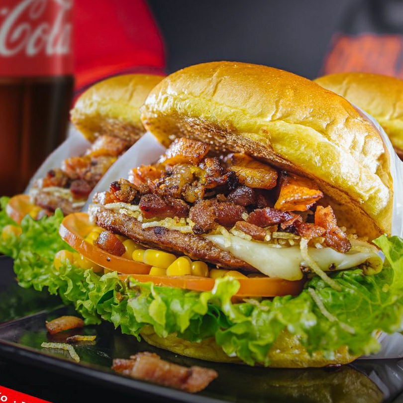 Pão macio, hambúrguer bovino, duas porções de bacon crocante, ovo, queijo prato derretido, presunto, alface, tomate, milho, batata palha extra fina e molho especial da casa + molho de alho.