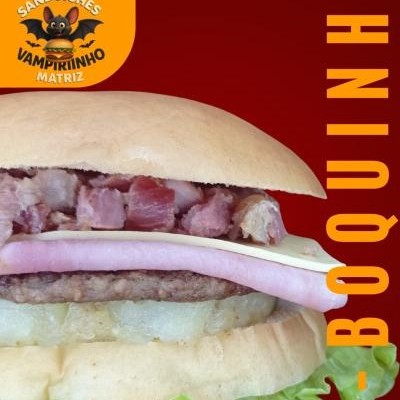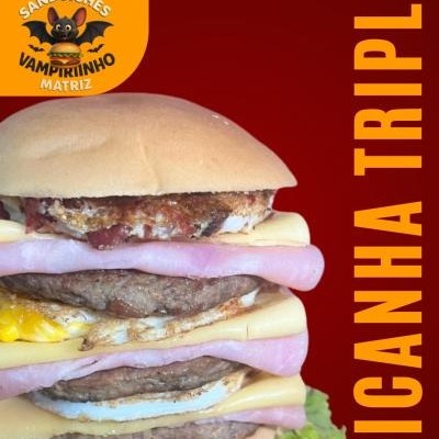 Pão, 3 hambúrgueres de picanha 120g cada, 3 ovos, bacon, queijo, presunto, alface, tomate, batata, milho e molho especial.