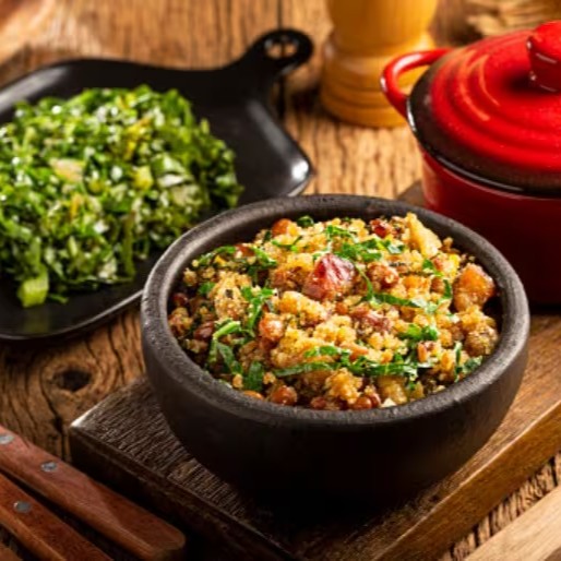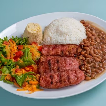 Linguiça Mineira. Acompanha: Arroz branco, feijão comum, couve manteiga refogada, farofa da casa Linguiça (porco) frita na hora e salada separada. Marmitex quentinha, feita na hora do pedido! Indicada para 1 pessoa.