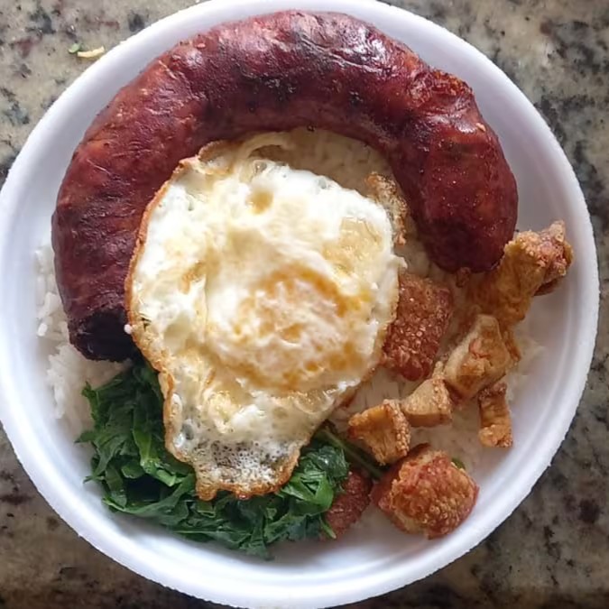 Marmita kaol ( sem feijão) . Marmita preparada com arroz branco, ovo frito, linguiça inteira, couve-manteiga refogada e torresmo. Marmitex quentinha, feita na hora do pedido! Indicada para 1 pessoa.(Almoço)
