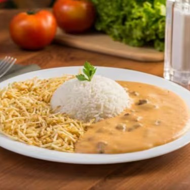 Marmita de strogonoff de frango. Marmitex com arroz branco, delicioso strogonoff de frango e batata palha (extra fina) qualidade sempre. Marmitex quentinha, feita na hora do pedido! Indicada para 1 pessoa.
