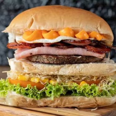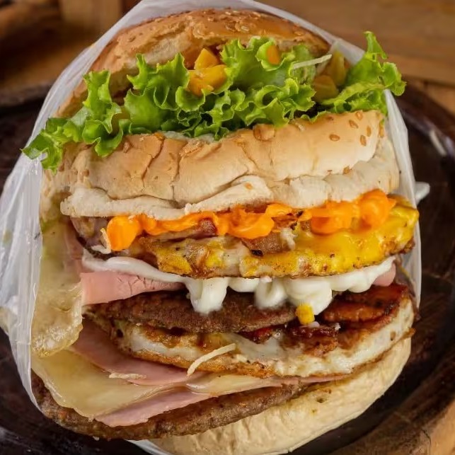 O lanche definitivo para quem ama comer muito: 3 Carnes, 3 Ovos, Fatias de Bacon, Queijo Muçarela, Presunto, Alface, Tomate, Milho, Batata Palha e um Molho Especial.