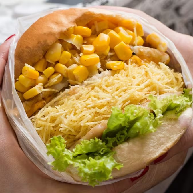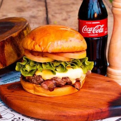 Pão de hamburguer, 01 carne bovina, cebola caramelizada, tomate, alface, batata palha, milho verde e molho especial.
