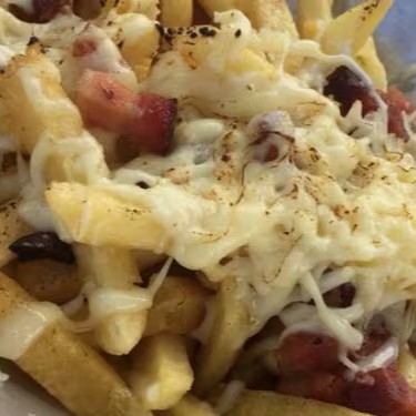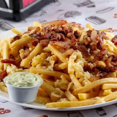 500g de batata frita, 100g de bacon em cubos, 100g de calabresa, muçarela, barbecue e cheddar.