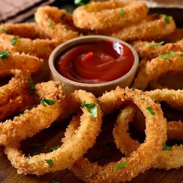 Onion rings crocantes e dourados, preparados com um empanado perfeito