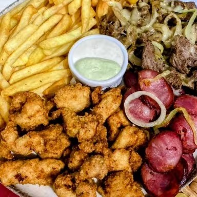 500g de batata frita, 300g de calabresa acebolada, 300g de frango a passarinho e 300g de pernil. Para completar, 10 anéis de cebola, queijo muçarela, cheddar e molho barbecue.