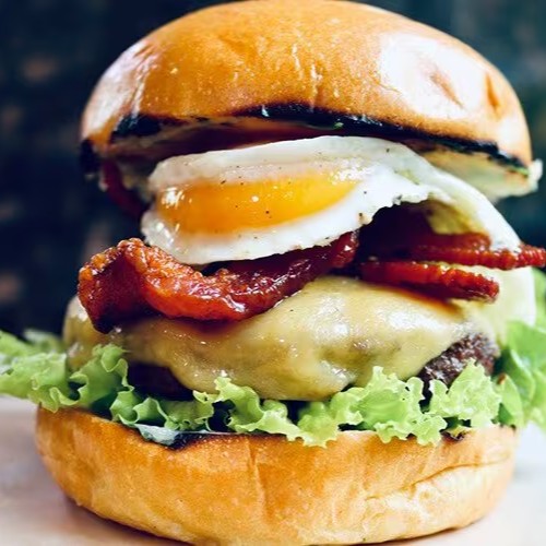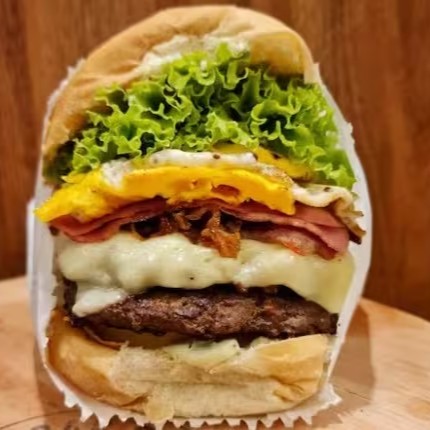 Pão selado, 2 carnes artesanais de 120g, 2 ovos, duplo bacon, duplo queijo, alface, tomate, molho da casa