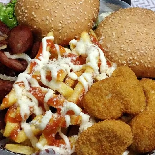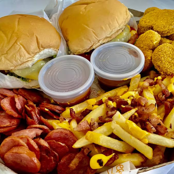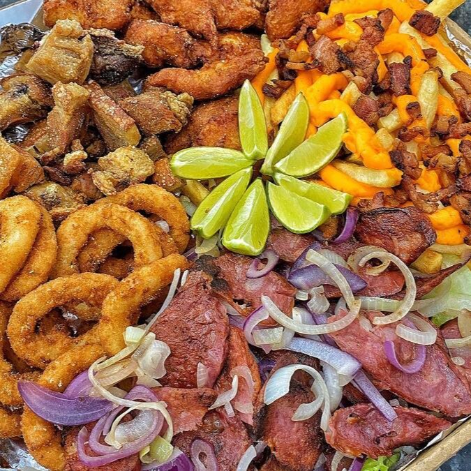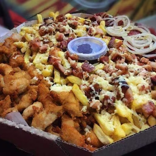 200g de calabresa, 200g de torresmo, 300g de frango à passarinho e 500g de batata frita. Finalizada com queijo muçarela, cheddar e molho barbecue.