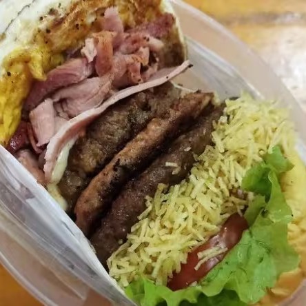 Pão, 01 carne bovina, 01 ovo, mussarela, presunto, tomate, alface, milho, batata, molho especial.