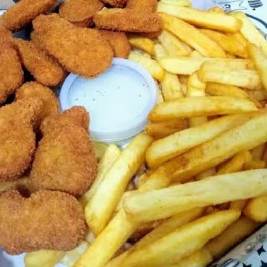 500g de batatas fritas com 10 unidades de nuggets.