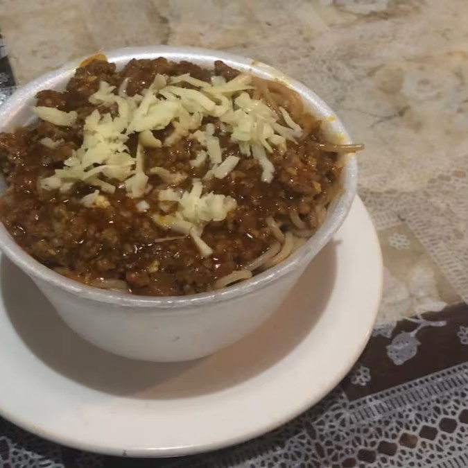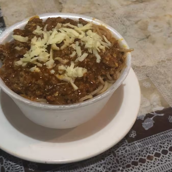 Macarao,carne moida no molho,com queijo ralado por cima
