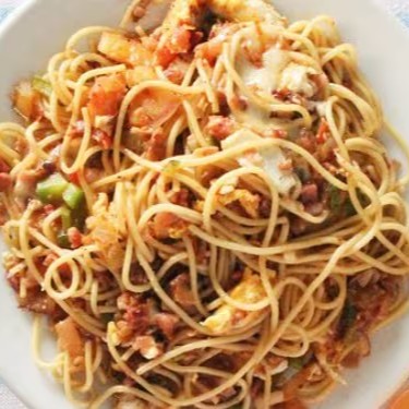 Experimente este delecioso macarao na chapa feito a perfeicao, contendo espaquete. bacon, calabresa, tomate, pimentao, cebolae molho