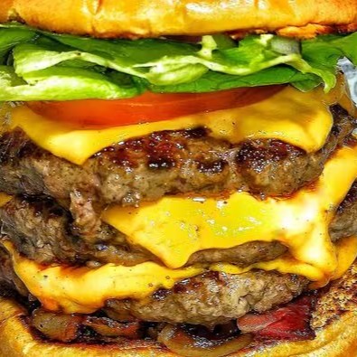 Pão selado, 3 carnes artesanais de 120g, triplo queijo, triplo bacon, alface, tomate e cebola roxa.