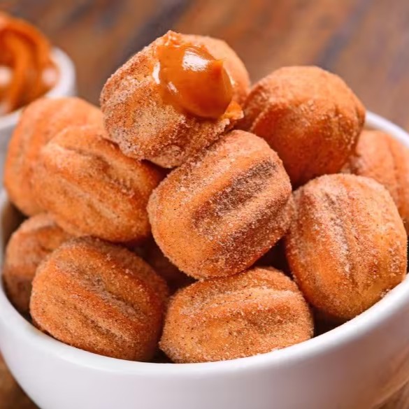 Mini Churros recheados de doce de leite, passados na canela e açúcar.