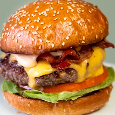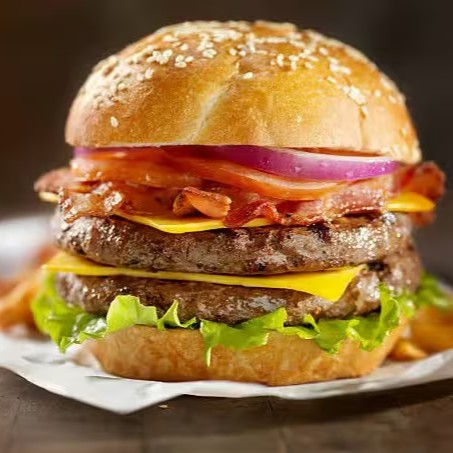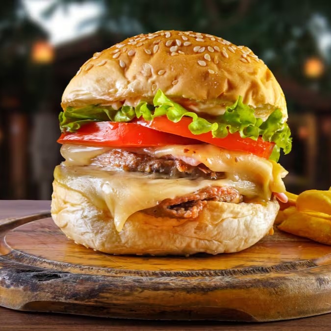 Pão selado, carne artesanal de 120g, duplo cheddar, bacon, alface, tomate.