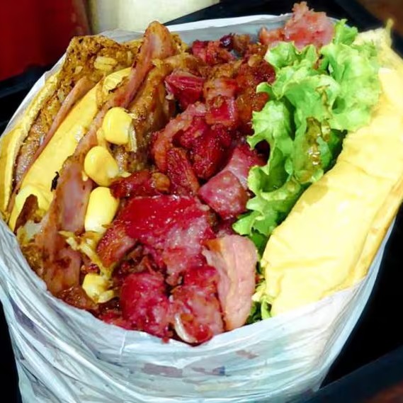 (Pão, 02 ovos, 02 carnes, bacon, presunto, mussarela, alface, tomate, molho especial, milho, batata palha)