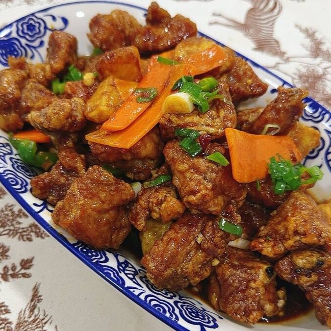 Costelinha suína com batata, cenoura, alho, cebolinha verde e cebolinha branca.(Não retiramos ingredientes).