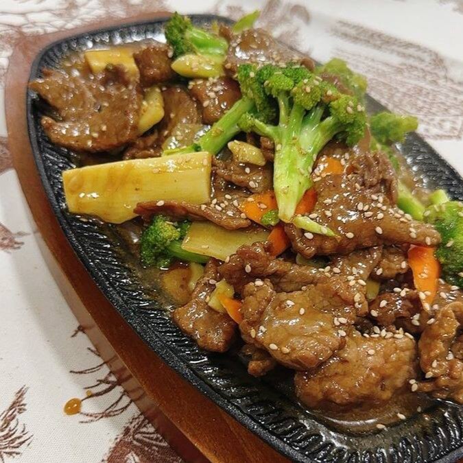 Carne de boi com pimenta preta, brócolis, cenoura, cebola, alho, broto de bambu, gergelim branco. (Não retiramos ingredientes).