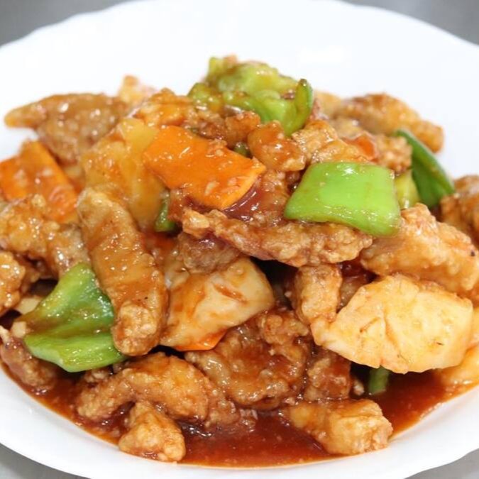 Lombo suíno agridoce com vinagre, abacaxi, cenoura, pimentão e alho. (Não retiramos ingredientes).