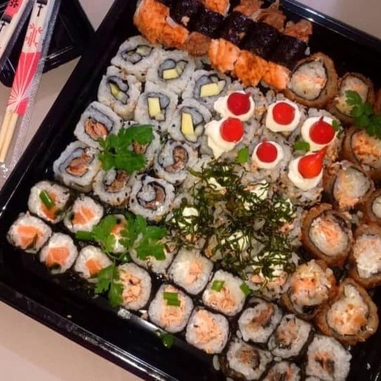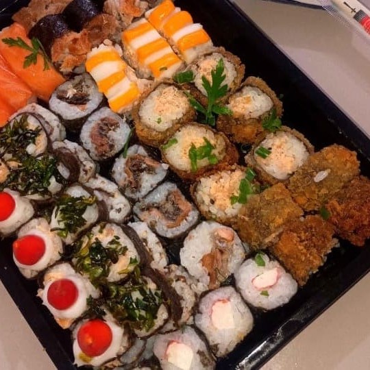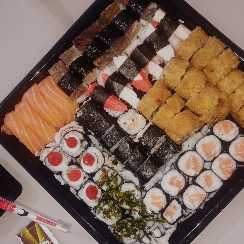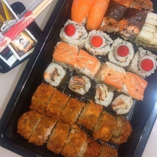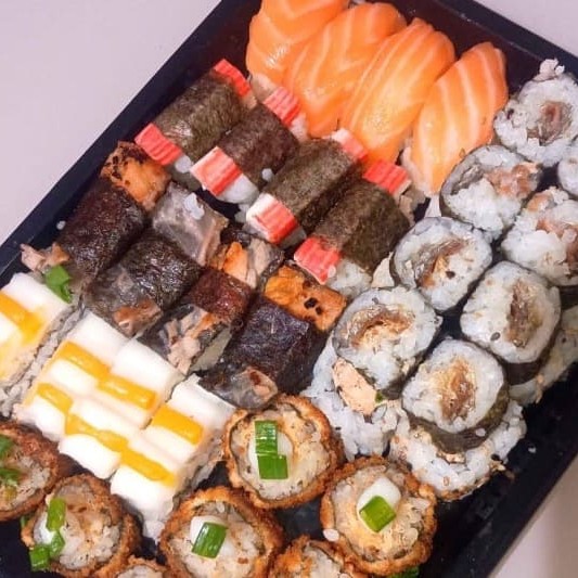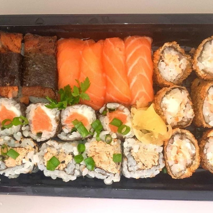 4 Niguiri salmão,6 niguiri pele,6 niguiri Kani,10 uramaki grelhado,10 uramaki Califórnia, 10 maki salmão, 10 maki grelhado,6 maki pele com couve,6 maki pele com pimenta biquinho,12 hot Filadélfia . acompanha kit: 2 shoyu,2 tare,2 Hashi,molheira.