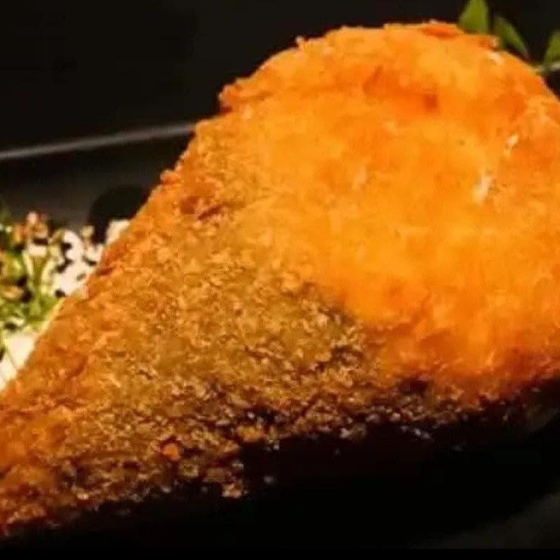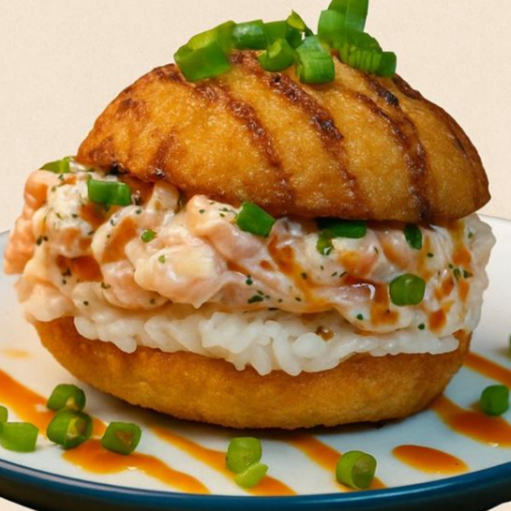 HAMBURGUER DE SALMAO :BASE DE ARROZ EMPANADO E FRITO ,SALMAO COM TOQUE DEFUMADO ,CREME SHESE ,TERIAKY ,COUVE CRISPE TEMPERADA .