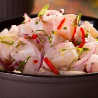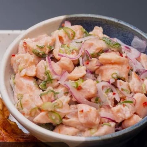 Ceviche de salmão: salmão malinado no limão ,azeite ,cebola Rocha, rondanshe,cheiro verde, pimenta dedo de moça
